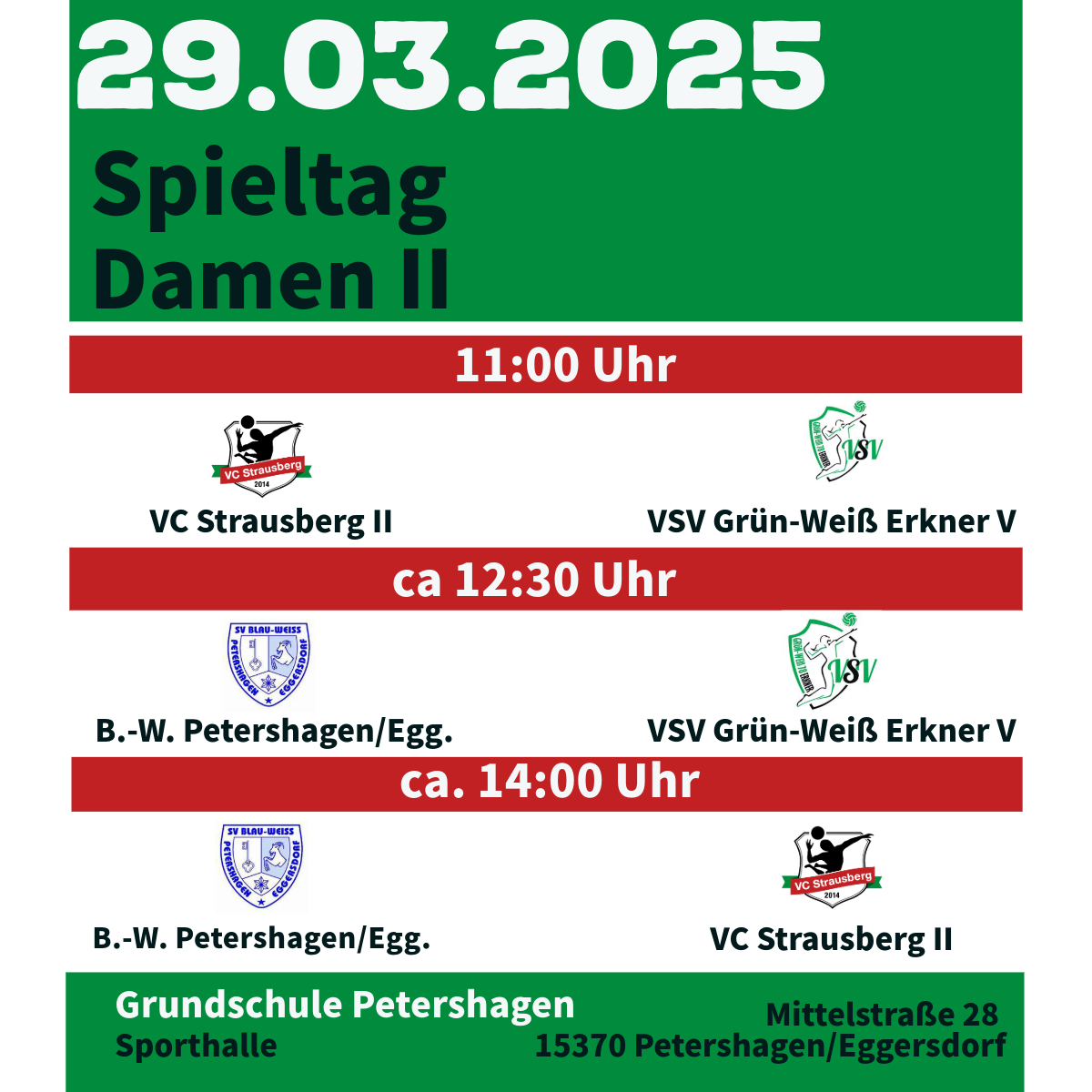Heute steht für die Damen II ein spannender Spieltag in der Kreisunion MOL/LOL an. Sie treten gegen den ungeschlagenen Tabellenführer Blau Weiß Petershagen/Eggersdorf und den Tabellenletzten VSV Grün-Weiß-Erkner V an.